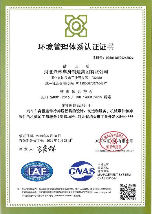在公司領導大力支持、各部門員工的不懈努力下,經過認證公司專家的全面、嚴格,細致的指導和審核,確認我公司環境管理體系符合ISO14001:2015的標準要求,并于2018年5月28日,向我公司正式頒發過ISO14001:2015環境管理體系認證。ISO14001是ISO14000系列標準的龍頭標準。這個標準的核心是規定了環境管理體系的要素(共五個部分,17個要素),也就是說對環境管理體系提出規范性要求,一切組織的環境管理體系必須遵照本標準的要素、規定和模式。